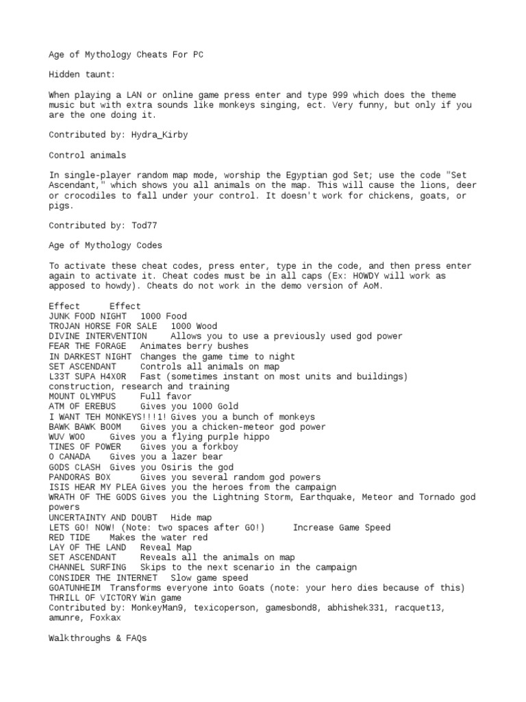 Cheat Code Age Of Mythology Cheats