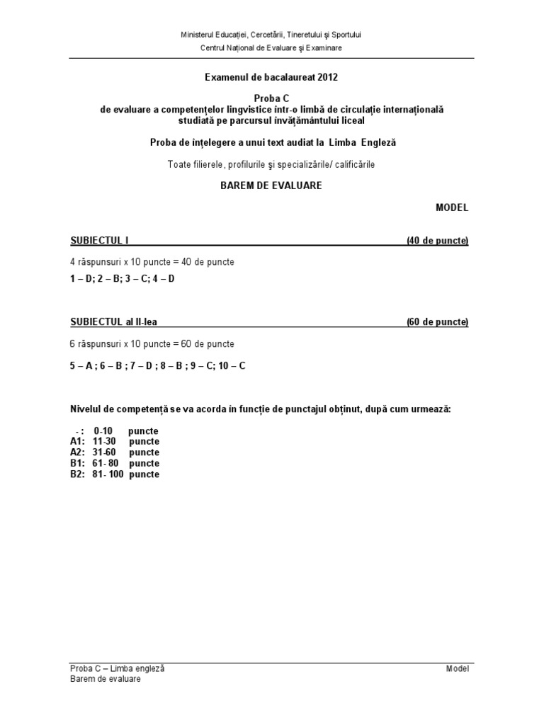 Subiecte competente digitale 2019 bac edu ro. C limba engleza audio text 2016 model barem c limba engleza audio text 2016 model subiect c limba engleza bilet oral 2016 model barem c limba engleza bilet oral 2016. în perioada 12 13 iunie 2019 se va desfășura evaluarea competențelor lingvistice într o limbă de circulație internațională. Microsoft word c engleza oral model barem doc author.