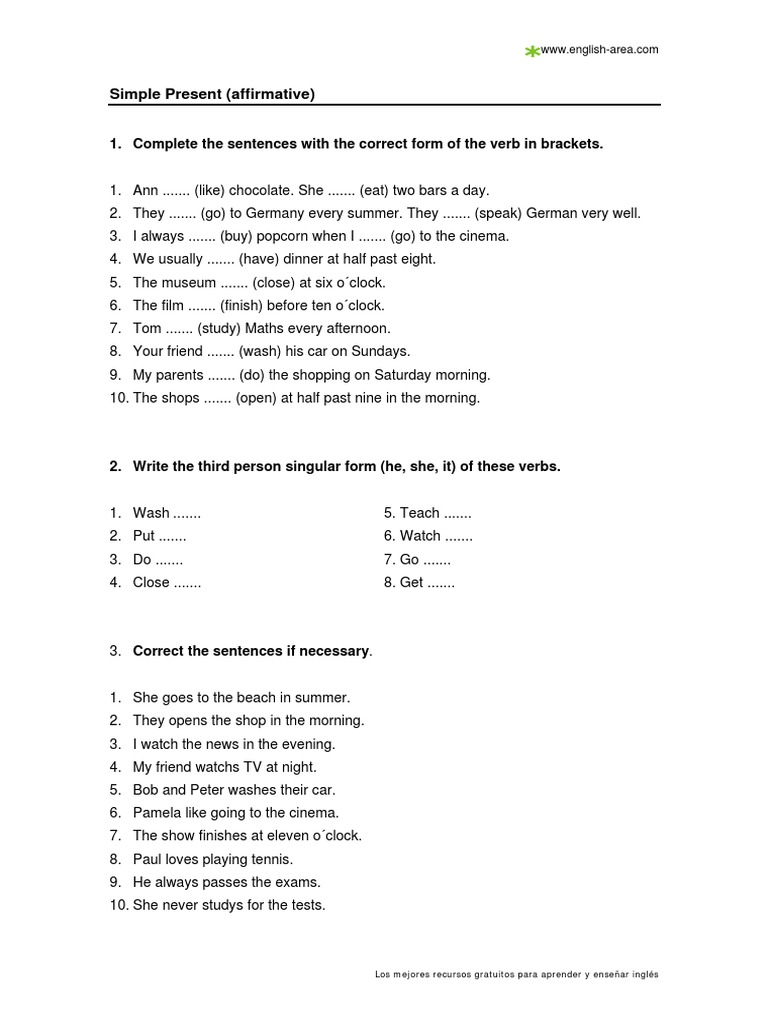 Simple Present Affirmative 1 Complete The Sentences With The Correct Form Of The Verb In Brackets