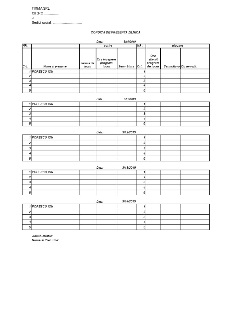 Condica de prezenta 2019 model. Fisierul pune la dispozitie mai multe sheet uri pe care se poate lucra pentru o evidenta mai usoara la nivel de unitate speram sa va fie de folos. In partea de jos a paginii vei gasi gratuit un model de condica de prezenta necompletat disponibil pentru descarcare in format editabil word sau pdf. 1 post page 1 of 1. Calculator salariu brut net zile libere 2019.