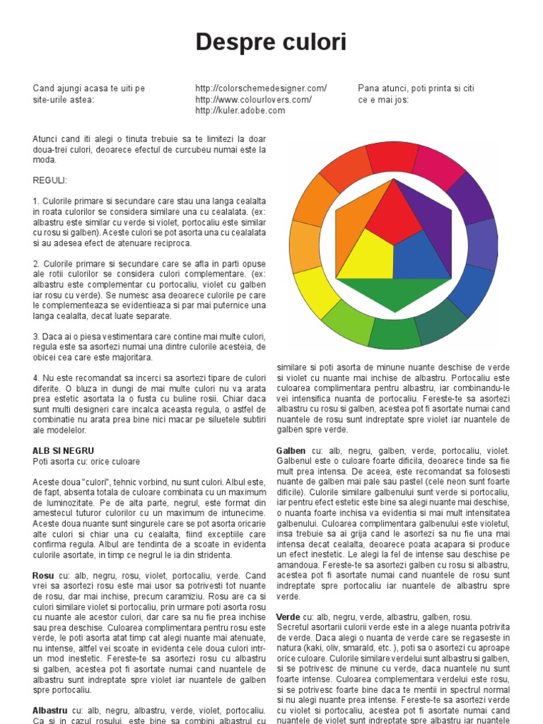 Culori care se potrivesc cu rosu. Este bine sa stii ca daca te imbraci in negru din cap pana in picioare trebuie sa porti niste accesorii care sa sparga monotonia. Culoarea complimentara pentru rosu este verde le poti asorta atat timp cat alegi nuante mai atenuate nu intense altfel vei scoate in evidenta cele doua culori intr un mod inestetic. Albul se combina cu orice. Cea mai buna combinatie ramane albastru rosu si negru.