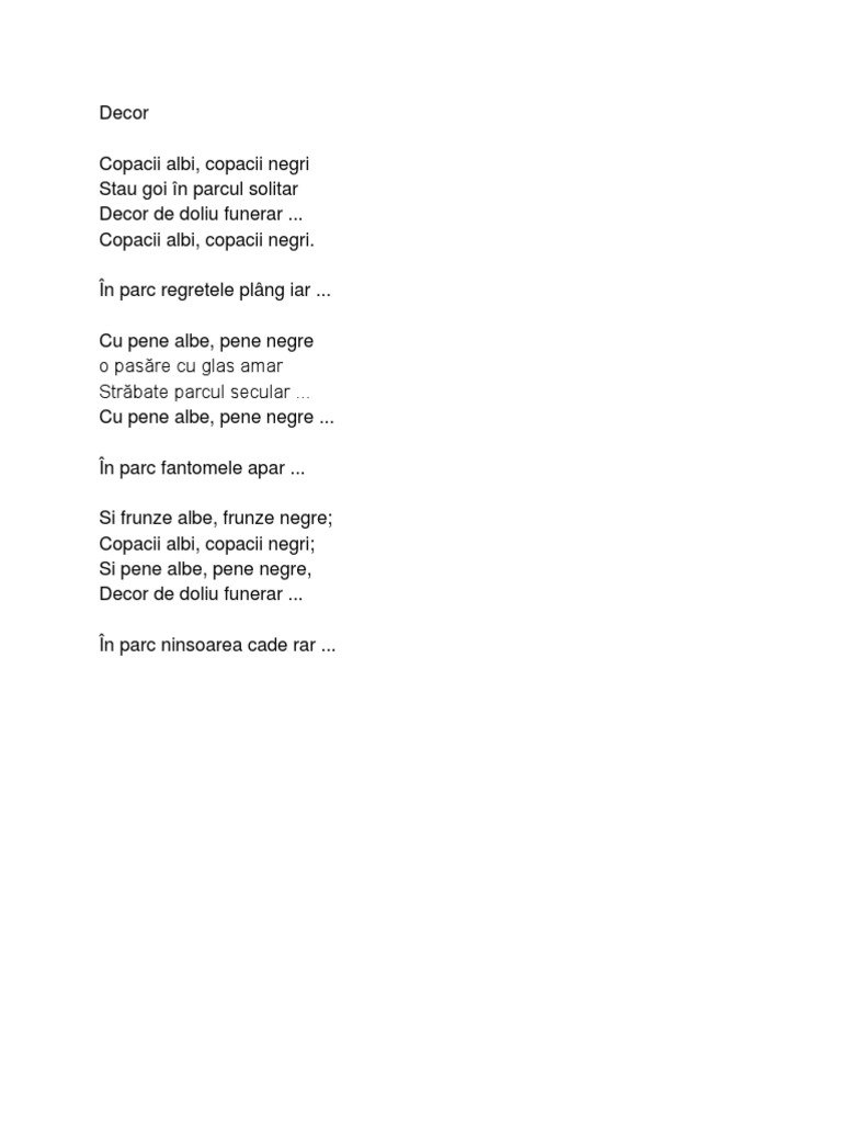 Copacii albi copacii negri. Poezia decor a fost introdusă în volumul de debut plumb în 1916. Poezia decor de george bacovia apare in revista faclia la 1 ianuarie 1916 insotita de o prezentare a autorului facuta de alexandru macedonski. De george bacovia georgebacovia 2006 08 20.