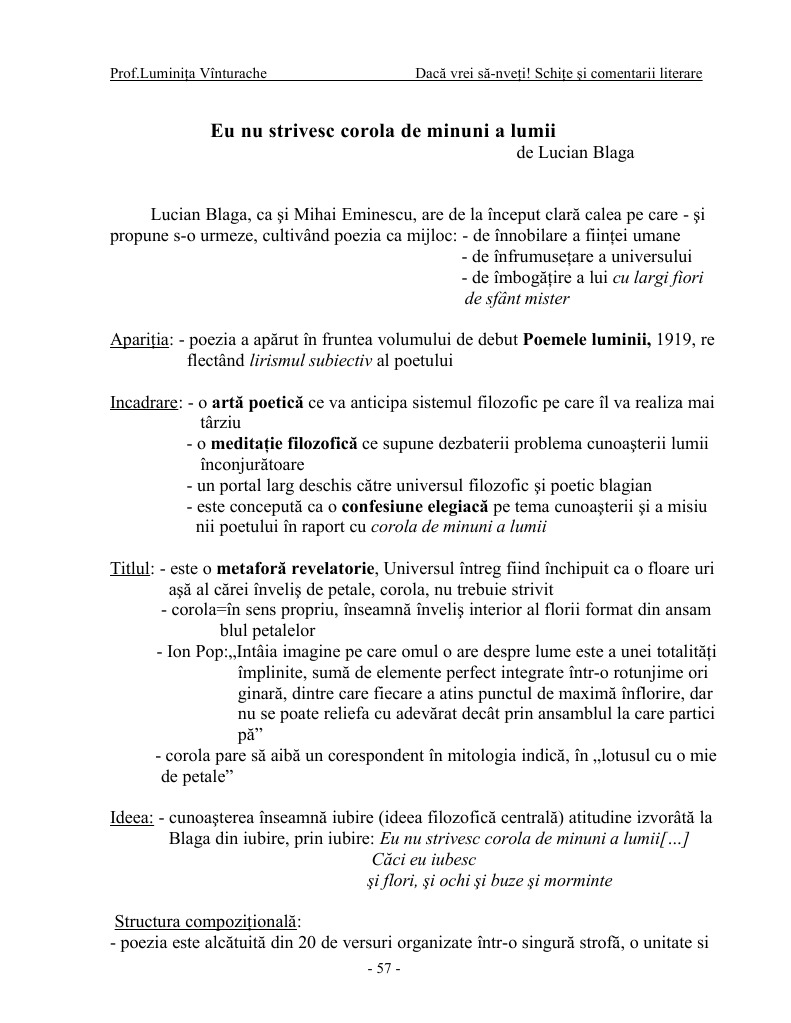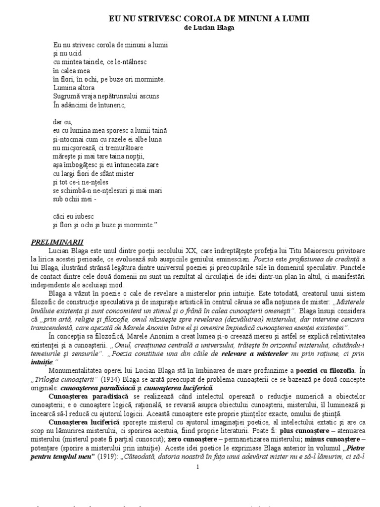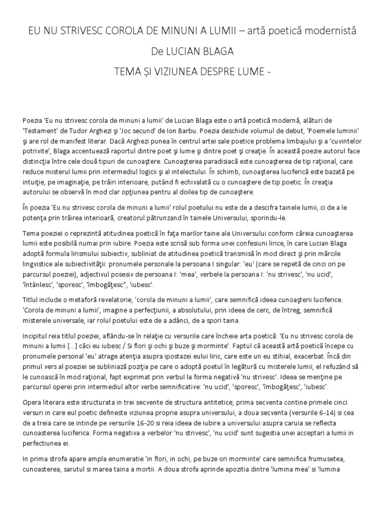 Eu nu strivesc corola de minuni a lumii eu nu strivesc corola de minuni a lumii şi nu ucid cu mintea tainele ce le ntâlnesc în calea mea în flori în ochi pe buze ori morminte.